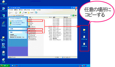 開いたフォルダ内の「log」フォルダ、「HTClient.log」ファイル、「HTServer.log」ファイルの合計3つを、任意の場所にコピーしてください。(図ではデスクトップにコピーしています)